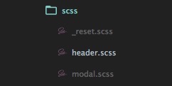 @import命令在css模块化的运用中起着重要的作用,它用来引入外部的文件。比如我们已经写好了_reset.scss、header.scss和modal.scss,如下: