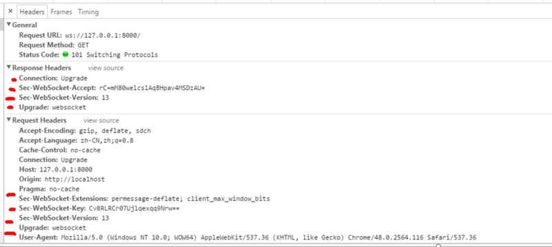 前面说了WebSocket与HTTP有交集的,或者可以说WebSocket借助了HTTP的基础就是体现在这里了,可以看到图中的红点,分别是WebSocket的请求头和响应头,一来一回,握手也就完成了,实时连接也就建立起来了!