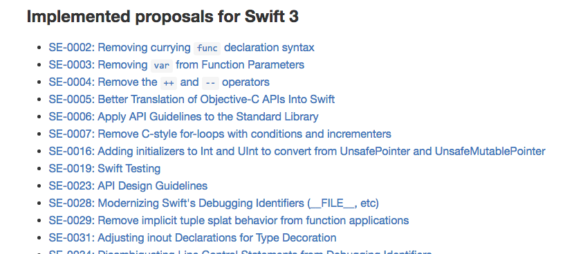 还是在上一篇关于Swift 3.0 介绍文章中的,关于 Swift 3.0 计划的主页上,我们可以看到关于 3.0 更新的提案列表: