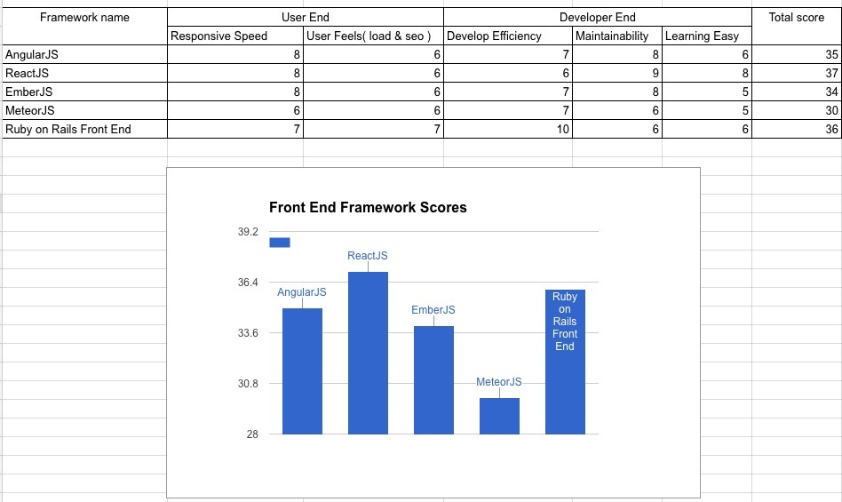 而 EmberJS 学习门槛过高, 而且 EmberJS 发展也比较迅速, 不利于学习掌握, 相对而言, 总分也不会太高.