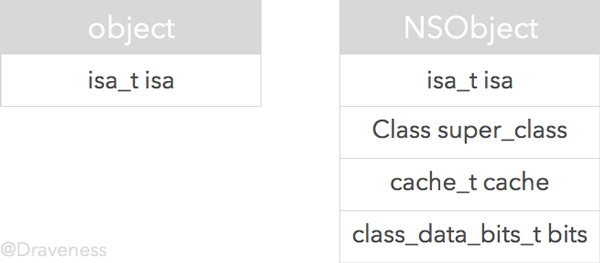 struct objc_class : objc_object { isa_t isa; Class superclass; cache_t cache; class_data_bits_t bits; }; 由于 objc_class 结构体是继承自 objc_object 的,所以在这里显式地写出了 isa_t isa 这个成员变量。
