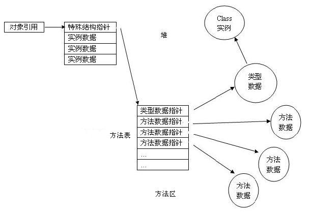 Java对象中包含的基本数据由它所属的类及其所有超类声明的实例变量组成。只要有一个对象引用,虚拟机就必须能够快速地定位对象实例的数据。另外,它也必须能通过该对象引用访问相应的类数据(存储于方法区的类型信息),因此在对象中通常会有一个指向方法区的指针。当程序在运行时需要转换某个对象引用为另外一种类型时,虚拟机必须要检查这种转换是否被允许,被转换的对象是否的确是被引用的对象或者它的超类型。当程序在执行instanceof操作时,虚拟机也进行了同样的检查。所以虚拟机都需要查看被引用的对象的类数据。