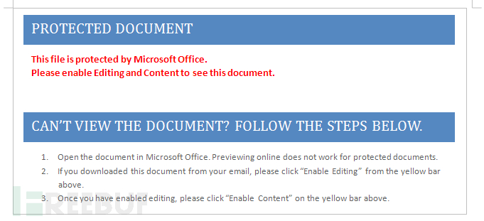 该word附件名为invoice.doc。打开发现只有如下内容,说该文件是被保护的文档,只有点击“Enable Editing” (允许编辑) 和”enable content” (启用内容)后才能显示正真的内容。