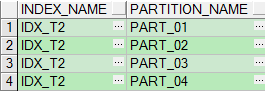 create table t2 ( id number primary key, t1_id number, t2_date DATE) partition by range (t2_date) ( partition part_01 values less than (to_date('2016-01-02','yyyy-mm-dd')), partition part_02 values less than (to_date('2016-01-03','yyyy-mm-dd')), partition part_03 values less than (to_date('2016-01-04','yyyy-mm-dd')), partition part_04 values less than (to_date('2016-01-05','yyyy-mm-dd')) ); CREATE INDEX idx_t2 ON t2(t1_id) LOCAL; INSERT INTO t2 VALUES(1, 1, to_date('2016-01-01','yyyy-mm-dd')); INSERT INTO t2 VALUES(2, 1, to_date('2016-01-02','yyyy-mm-dd')); INSERT INTO t2 VALUES(3, 1, to_date('2016-01-03','yyyy-mm-dd')); INSERT INTO t2 VALUES(4, 1, to_date('2016-01-04','yyyy-mm-dd')); COMMIT; SELECT index_name,partition_name from user_ind_partitions WHERE INDEX_name = 'IDX_T2';
