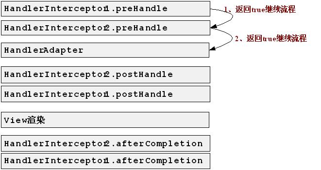 package cn.javass.chapter5.web.interceptor; //省略import public class HandlerInterceptor1 extends HandlerInterceptorAdapter {//此处一般继承HandlerInterceptorAdapter适配器即可 @Override public boolean preHandle(HttpServletRequest request, HttpServletResponse response, Object handler) throws Exception { System.out.println("===========HandlerInterceptor1 preHandle"); return true; } @Override public void postHandle(HttpServletRequest request, HttpServletResponse response, Object handler, ModelAndView modelAndView) throws Exception { System.out.println("===========HandlerInterceptor1 postHandle"); } @Override public void afterCompletion(HttpServletRequest request, HttpServletResponse response, Object handler, Exception ex) throws Exception { System.out.println("===========HandlerInterceptor1 afterCompletion"); } } 以上是HandlerInterceptor1实现,HandlerInterceptor2同理 只是输出内容为“HandlerInterceptor2”。