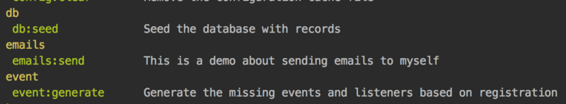 class SendEmails extends Command { /** * The name and signature of the console command. * * @var string */ protected $signature = 'emails:send'; /** * The console command description. * * @var string */ protected $description = 'This is a demo about sending emails to myself'; /** * Create a new command instance. * * @return void */ public function __construct() { parent::__construct(); } /** * Execute the console command. * * @return mixed */ public function handle() { $this->info('I am handsome'); $this->error('I am not ugly'); } } 写上$description和handle()方法,$description变量用来显示命令的说明,handle()用来处理命令,然后在AppConsoleCommandsKernel.php中注册命令: