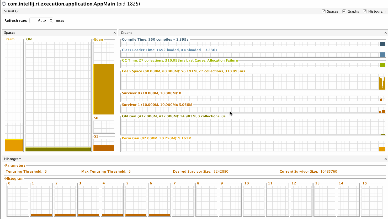 在解决很多问题的时候,工具起的作用往往是巨大,很多时候通过工具分析,很快便能找到原因,但是这次并没有,下图是VisualVM观察到Heap上的GC图表。