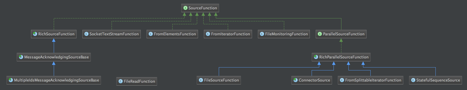 这些连接器有些可以同时作为 source 和 sink 。因为我们今天的主题是source,所以我们先来看看以上这些被支持的连接器它们的source都是继承自刚刚我们谈到的哪些接口或者类。