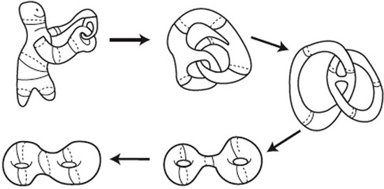 2这个数字,是第一个拓扑数,它标记拓扑等价于球面的几何体。所谓拓扑等价,指的是如果两个几何体可以通过连续拉伸、扭曲、旋转等操作变换到对方(如图1),这些操作不能是粘合、撕裂,那么这两个几何体称作是拓扑等价的。因此,也有人形象地将拓扑学称为橡皮几何学,因为它研究的性质在图形做弹性形变时是不会改变的。