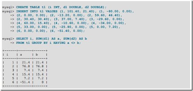 Floating-point numbers sometimes cause confusion because they are approximate and not stored as exact values. A floating-point value as written in an SQL statement may not be the same as the value represented internally. Attempts to treat floating-point values as exact in comparisons may lead to problems. They are also subject to platform or implementation dependencies. The FLOAT and DOUBLE data types are subject to these issues. For DECIMALcolumns, MySQL performs operations with a precision of 65 decimal digits, which should solve most common inaccuracy problems.