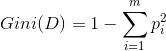 假设A有v个不同的值出现在特征D中,它的二元划分有$2^v - 2$种(除去自己和空集)。当考虑二元划分裂时,计算每个结果分区的不纯度加权和。比如A有两个值,则特征D被划分成D1和D2,这时Gini指数为: