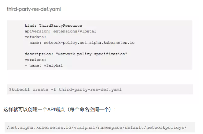 如果对这个运行不熟悉,Kubernetes API可以通过定义第三方资源(ThirdPartyResources)拓展,在指定的URL上创建一个新的API端点。