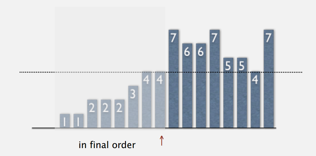 // quicksort the subarray a[lo .. hi] using 3-way partitioning private static void sort(Comparable[] a, int lo, int hi) { if (hi <= lo) return; int lt = lo, gt = hi; Comparable v = a[lo]; int i = lo; while (i <= gt) { int cmp = a[i].compareTo(v); if (cmp < 0) exch(a, lt++, i++); else if (cmp > 0) exch(a, i, gt--); else i++; } // a[lo..lt-1] < v = a[lt..gt] < a[gt+1..hi]. sort(a, lo, lt-1); sort(a, gt+1, hi); } 思路: