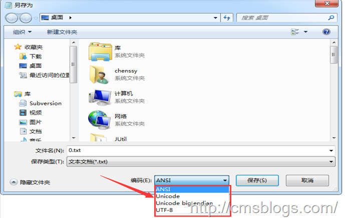 在最下面的”编码(E)”处有四个选项:ANSI、Unicode、Unicode big endian、UTF-8。