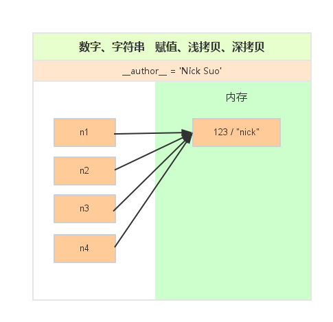 对于 数字 和 字符串 而言,赋值、浅拷贝和深拷贝无意义,因为其永远指向同一个内存地址。