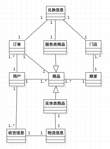 根据以上需求,可以初步得到相关的领域概念有:商家、商品、实体类商品、服务类商品、物流信息、门店、用户、收货信息、订单、兑换信息。理清这些领域概念之间的关系之后,可以得到类似于下面的领域模型视图: