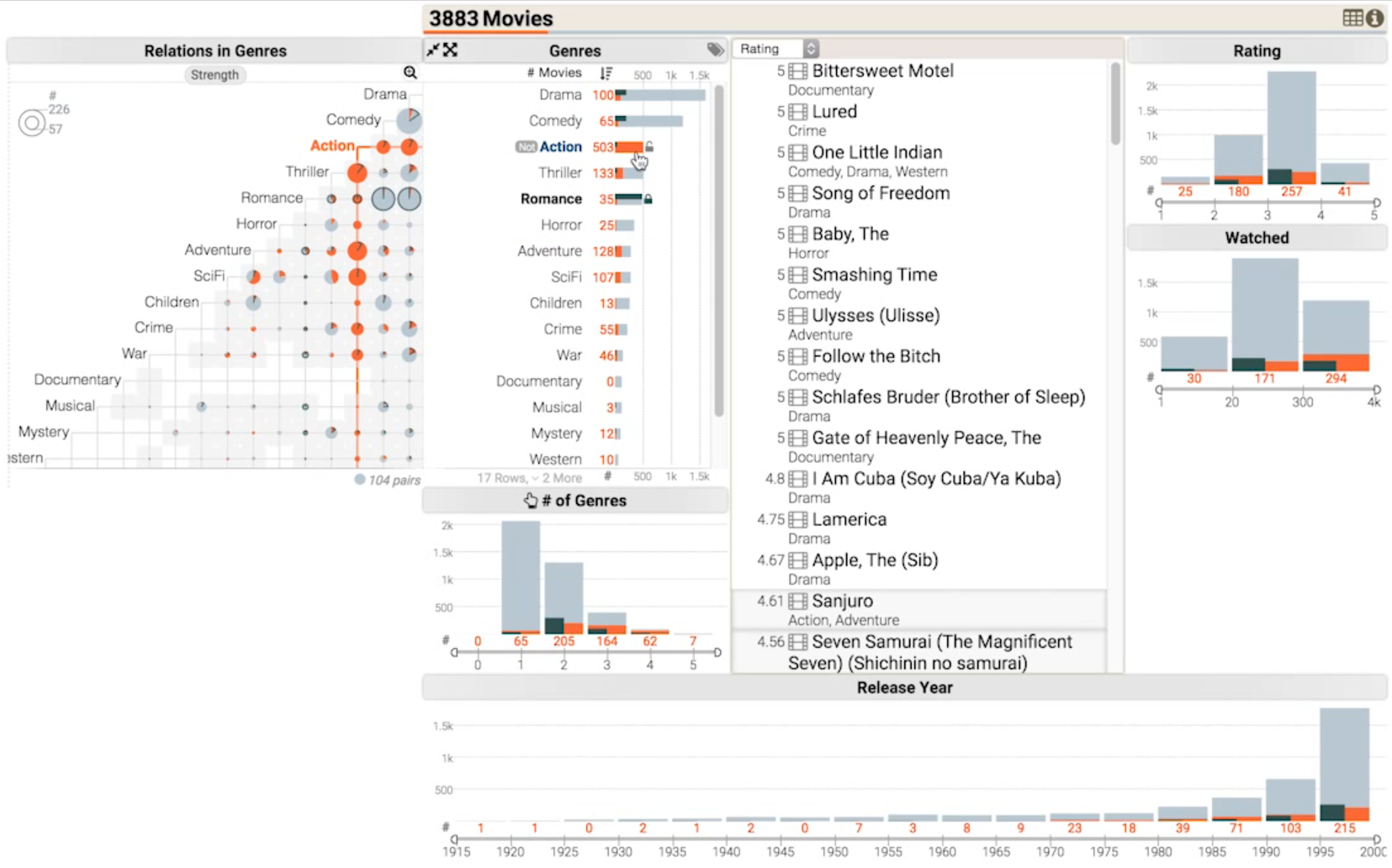 - 矩阵图统计。科幻冒险电影中,有超过半数的动作电影(橘色)和很少的烂漫电影(黑色)。