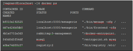 整个系统是通过相互交互并提供上述服务的容器构建起来的。如果在设置 Vagrant 后查看该工具箱,就可以看到以下运行的容器: