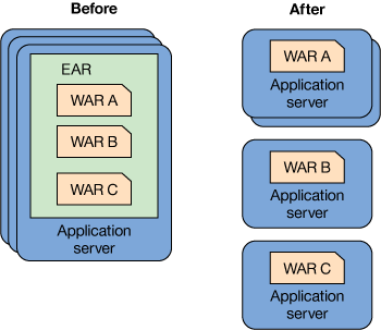 最好的起点是,重新检查您的 Java 应用程序打包结构,采用一些新的打包实践,然后再开始修改代码。在 21 世纪初,我们开始构建一些越来越大的 EAR 文件,以包含我们的逻辑应用程序。然后,我们将这些 EAR 文件部署到服务器场中的每个 WebSphere® Application Server 上。问题是,这种做法试图对应用程序的每段代码都使用相同的部署时间表和相同的物理服务器。任何改变都意味着要重新测试一切,这使得任何改变都变得过于昂贵,不在考虑范围之内。