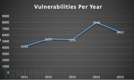 从上图可知, 2015 年有超过 3376 个高危漏洞,然而在 2014 年只有 2887 个。(多了 17% )