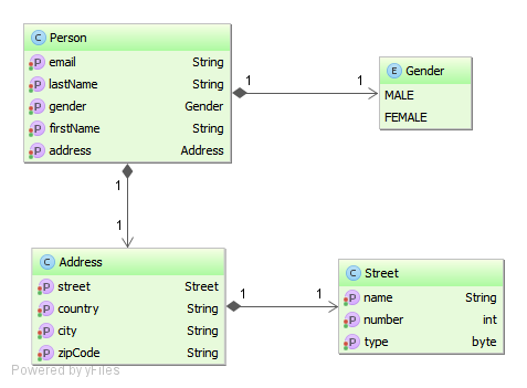 Street street = new Street(12, (byte) 1, "Oxford street"); Address address = new Address(street, "123456", "London", "United Kingdom"); Person person = new Person("Foo", "Bar", "foo.bar@gmail.com", Gender.MALE, address);