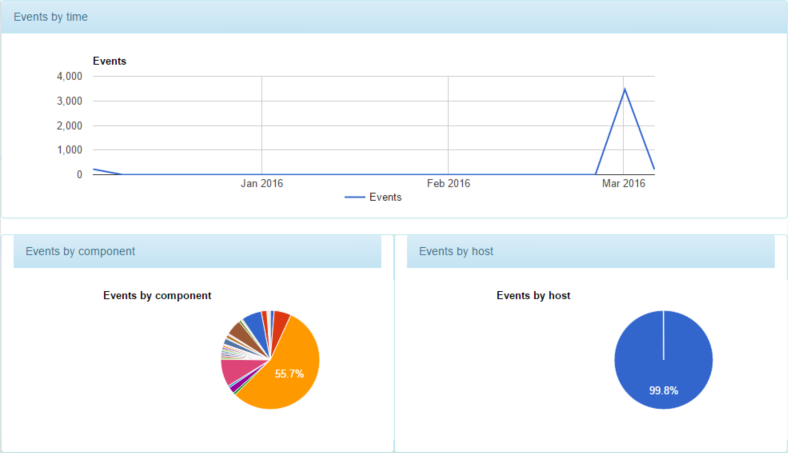 基本图表将会按时间显示所有事件(线图),以及来自每个主机和每个组件的事件数量(两个图都是饼图)。