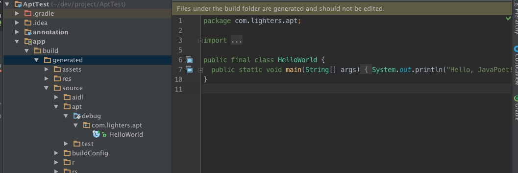 @Override public boolean process(Set<? extends TypeElement> annotations, RoundEnvironment roundEnv) { Set<? extends Element> set = roundEnv.getElementsAnnotatedWith(Test.class); for (Element element : set) { if (element.getKind() != ElementKind.CLASS) { processingEnv.getMessager().printMessage(Diagnostic.Kind.ERROR, "only support class"); } MethodSpec main = MethodSpec.methodBuilder("main") .addModifiers(Modifier.PUBLIC, Modifier.STATIC) .returns(void.class) .addParameter(String[].class, "args") .addStatement("$T.out.println($S)", System.class, "Hello, JavaPoet!") .build(); TypeSpec helloWorld = TypeSpec.classBuilder("HelloWorld").addModifiers(Modifier.PUBLIC, Modifier.FINAL).addMethod(main).build(); JavaFile javaFile = JavaFile.builder("com.lighters.apt", helloWorld).build(); try { javaFile.writeTo(processingEnv.getFiler()); } catch (IOException e) { e.printStackTrace(); } } return false; } 这里简单使用 JavaPoet 文档中的第一个example, 生成一个简单的HelloWorld类。大家可自己行去查看JavaPoet的更多用法,支持各种姿势生成Java的代码,并与 Processor 完美契合。