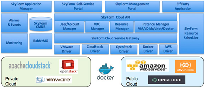 SkyForm CMP的核心子服务是由SkyForm Cloud Service Gateway、SkyForm Cloud API和各种功能组件、云平台驱动构成的SkyForm Multi-Cloud Engine。其中SkyForm Cloud Service Gateway对各种私有云、公有云进行统一的抽象并管理各种系统的不同能力, SkyForm Cloud API则对外提供抽象OpenStack兼容的API并提供特定功能的扩展。虚拟化平台(如VMware)、开源云OS平台(如CloudStack和OpenStack)、容器技术(如Docker)以及公有云(如AWS)通过Driver接入SkyForm CMP以满足多种应用场景的需求。SkyForm CMP的架构图如下所示。
