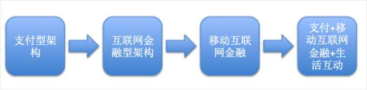 蚂蚁金服旗下的支付宝经过十几年的发展,从简单的支付工具逐步发展成互联网金融平台。2013年余额宝的崛起就是互联网金融平台升级的标志型事件,这一年支付宝顺利进行了PC向无线的布局,可以说架构成功升级到移动互联网金融平台。经过两年的发展,2015年口碑和社交业务的崛起让支付宝架构进一步在原有架构基础上拓展出支持线下市场和社交的生活互动型架构。2015年钱包9.0的发布,这个里程碑式的项目初步奠定了支付+移动互联网金融+生活互动型混合架构。演进示意图如图1所示。