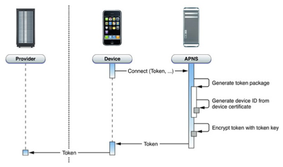 2.连接成功,APNs经过打包和处理产生devicetoken并返回给注册的Device(设备)