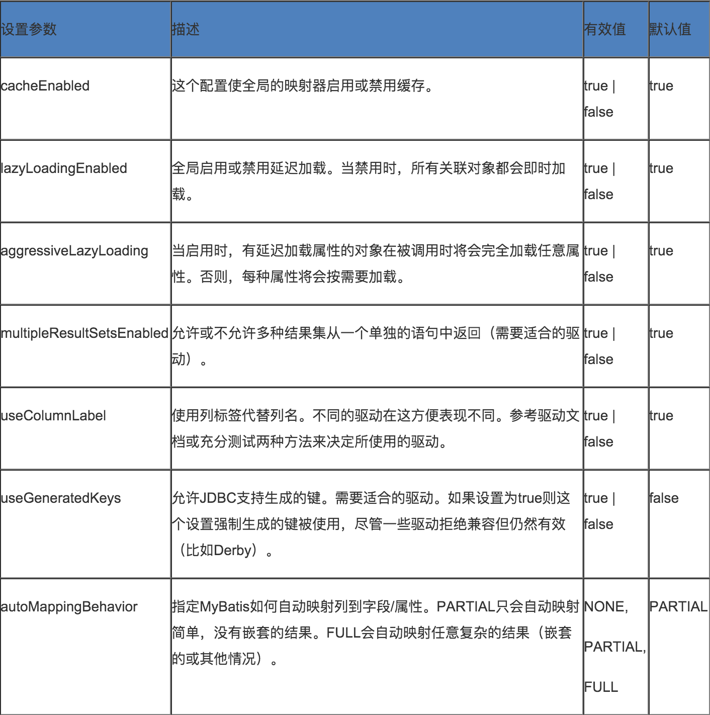 setting节点里配置的值会直接改写Configuration对应的变量值,这些变量描述的是Mybatis的全局运行方式,如果对这些属性的含义不熟悉的话建议不要配置,使用默认值即可。下面这个表格描述了各个配置项的含义和默认值: