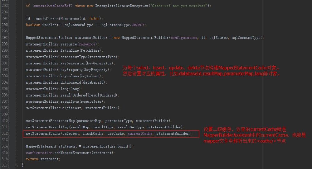 最终mapper配置文件中的<cache/>被设置到了XMLMapperBuilder的builderAssistant属性中,XMLMapperBuilder中使用XMLStatementBuilder遍历CRUD节点,遍历CRUD节点的时候将这个cache节点设置到这些CRUD节点中,这个cache就是所谓的二级缓存!