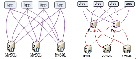 上述两种方案有一个非常重要的因素没有提及,在实际生产环境中面临一个非常现实的问题是MySQL能支持的连接数是有限的。以MySQL5.5来说假设一个MySQL实例配置1000个连接,业务应用实例部署了100个,每个应用实例的数据库连接池配置20个,采用客户端方案这个MySQL实例都没法正常工作了。