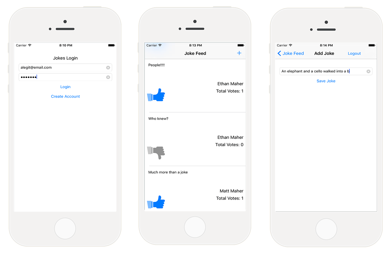 今天,我就带领大家用 Firebase 来做一款发布笑话的应用程序。这款应用允许用户用邮箱和密码进行注册和登录。登录成功之后就可以发布笑话,然后显示笑话的 tableview 会立刻更新。同样,如果其他人也发布了笑话,界面也会立马更新。为了增加应用程序的互动性,添加了点赞功能。如果笑话很有意思就会得到大家的赞誉。