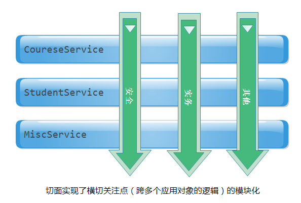 如上图所示,这就是横切关注点的概念,水平的是核心业务,这些切入的箭头就是我们的横切关注点。