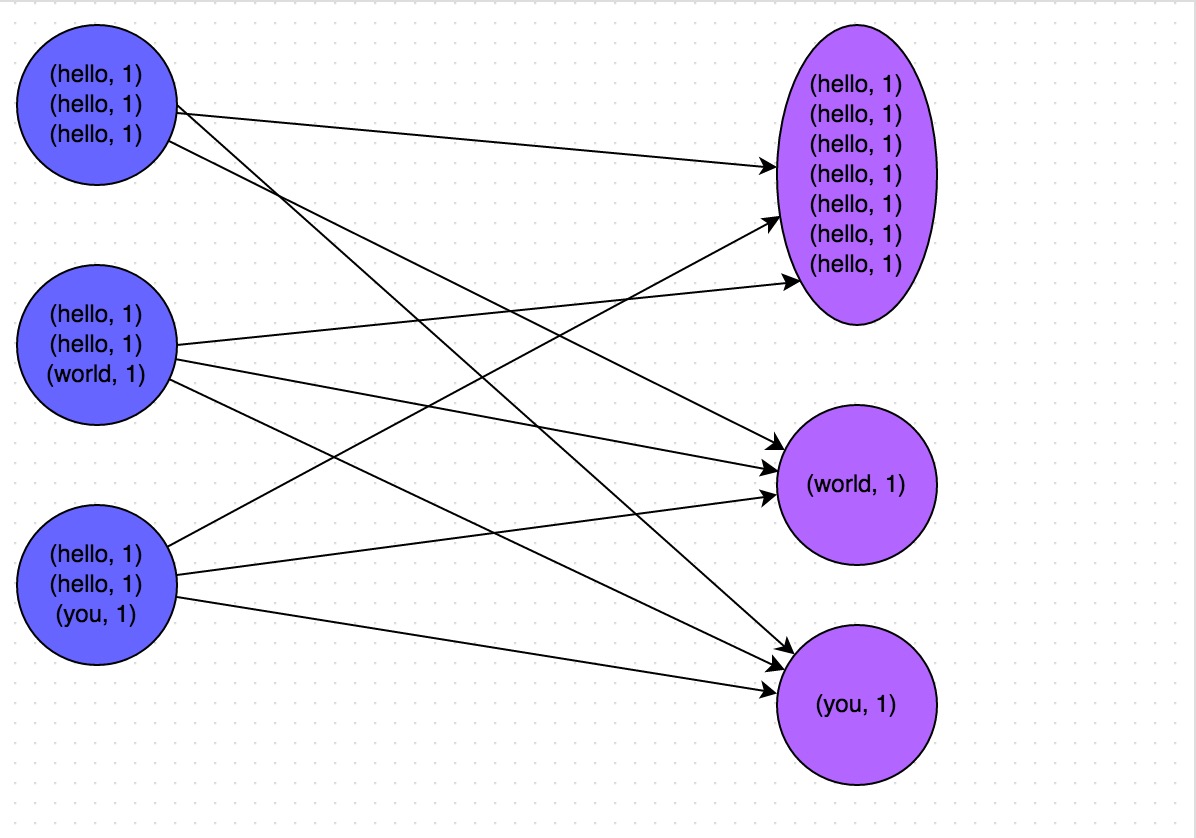下图就是一个很清晰的例子:hello这个key,在三个节点上对应了总共7条数据,这些数据都会被拉取到同一个task中进行处理;而world和you这两个key分别才对应1条数据,所以另外两个task只要分别处理1条数据即可。此时第一个task的运行时间可能是另外两个task的7倍,而整个stage的运行速度也由运行最慢的那个task所决定。
