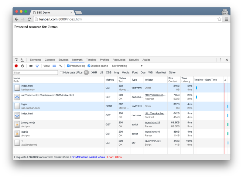 kanban.com:8000 (业务系统前端) api.kanban.com:9000 (业务系统后端API) sso.kanban.com:8100 (单点登录系统,登陆界面) 前端包含了HTML/JS/CSS等资源,是一个纯静态资源,所以本地磁盘即可。后端API则是一组需要被保护的API(比如查询工资详情,查询工作经历等)。最后,单点登录系统是一个简单的表单,用户填入用户名和密码后,如果登录成功,单点登录会将用户重定向到登录前的位置。