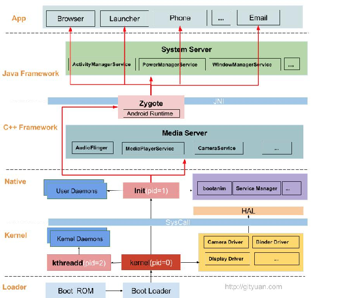 作为一个Android开发者,了解整个系统架构是必须的,所以这篇就总结一下Android手机从按下开机键到启动这一过程发生了什么。