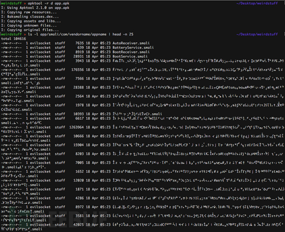 同其他有过APK反编译工作经验的逆向工作者一样,我已经很习惯程序中的类和名字被ProGuard混淆(或者被DexGuard混淆字符串等),这对我来说不是什么困难。但是当我使用apktool打开这个应用的时候还是大吃一惊: