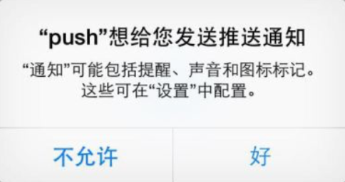 分为本地推送和远程推送2种。可以在应用没有打开甚至手机锁屏情况下给用户以提示。它们都需要注册,注册后系统会弹出提示框(如下图)提示用户是否同意,如果同意则正常使用;如果用户不同意则下次打开程序也不会弹出该提示框,需要用户到设置里面设置。一共有三种提示类型: