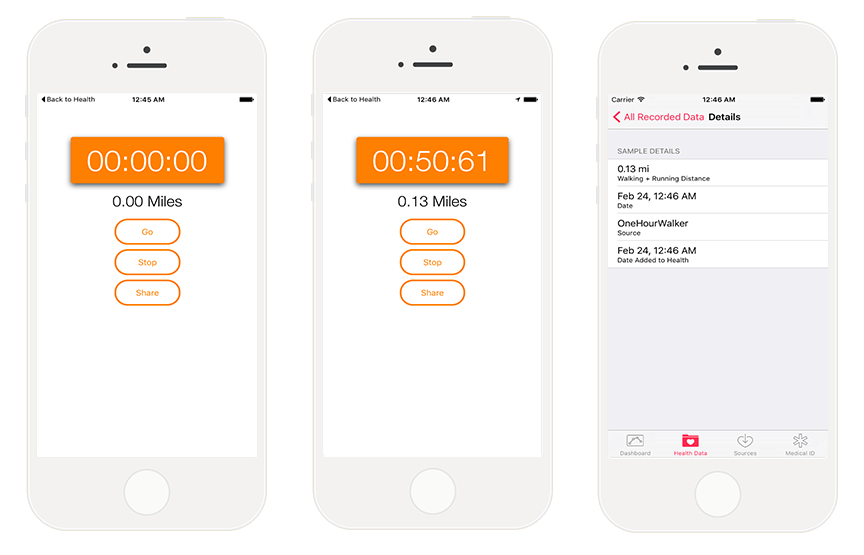 今天,我们要创建一个非常有趣的 App,既能读取 HealthKit 中的信息,也能写入新的数据。看一下 OneHourWalker 的外表吧: