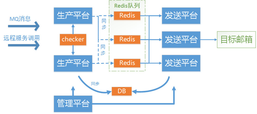 其次,我们发现发送端的消费能力是整个邮件发送流程的制约点,消费能力决定了某个时间内需要多少邮件发送任务,Checker扫描的量只要刚刚够发送端满负荷发送就可以了,因此,Checker不再每个几分钟扫表一次,只在队列长度低于某个下限值时才扫描,
