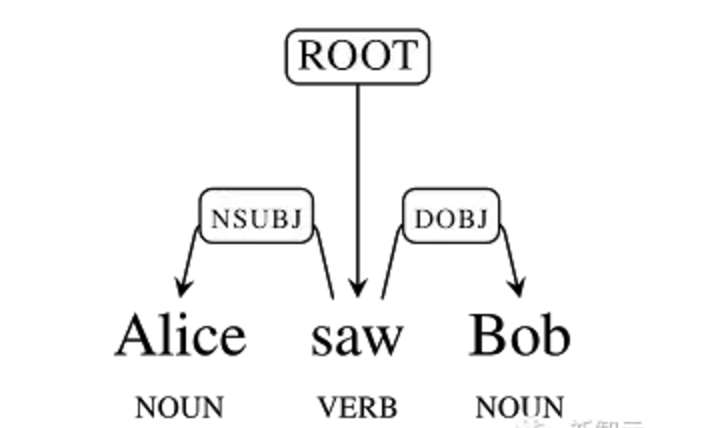 举一个很简单的例子,看下面这个句子“Alice saw Bob”的依存句法树: