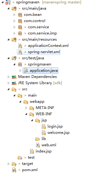 package springmaven; import org.springframework.context.ApplicationContext; import org.springframework.context.support.ClassPathXmlApplicationContext; import com.service.imp.IToDo; public class application { public static void main(String[] args) { ApplicationContext appCtx = new ClassPathXmlApplicationContext("applicationContext.xml"); IToDo tdo = (IToDo)appCtx.getBean("toDo"); tdo.toEat(); } } 工程图片