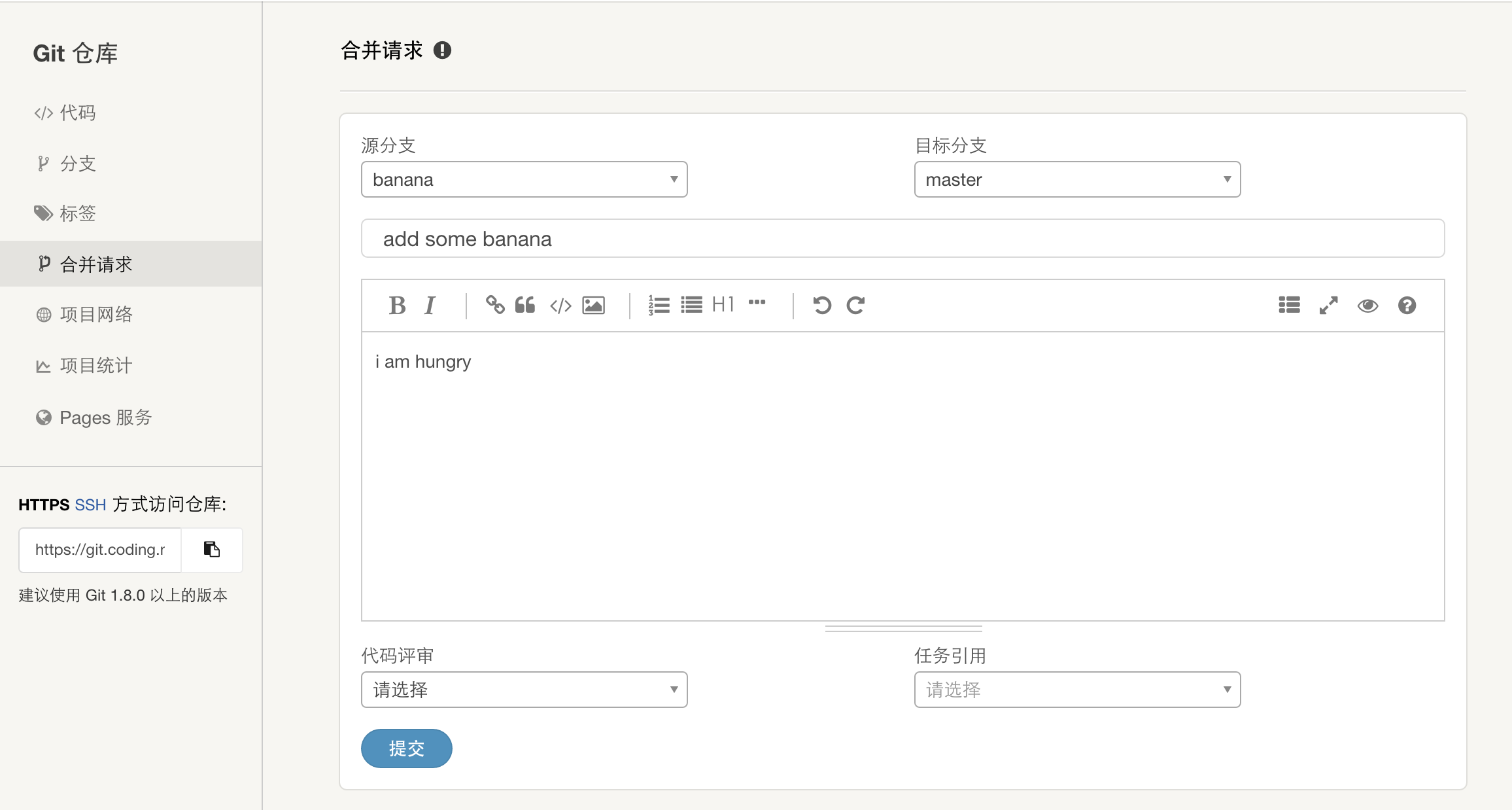 git push -u origin banana 洋葱猴完成了该功能的开发,并在 Coding.net 项目合并请求页面中发起了一个 Merge Request,请求合并 banana 分支到 master 分支,其团队成员会自动收到通知。 Coding.net 提供的 Merge Request 界面可以让团队成员在相关的代码旁边进行评论,更方便地对某个变更提问。