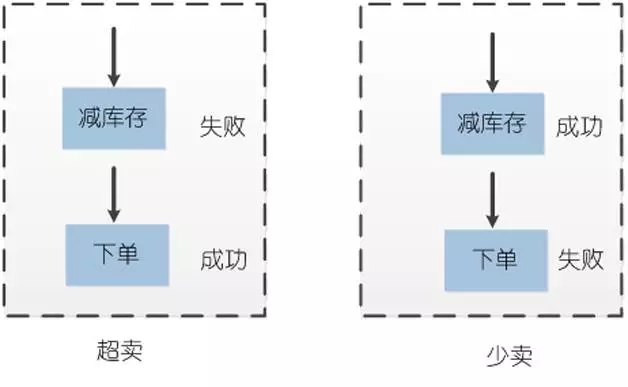 其次要解决的便是数据一致性的问题,对于高并发访问的浏览型系统来说,单机数据库如不进行扩展,往往很难支撑,因此,常常会采用分库技术,来提高数据库的并发能力,并且通过使用分布式缓存技术,将磁盘磁头的机械运动,转化为内存的高低电平,以降低数据库的压力,加快后端的响应速度,响应得越快,线程释放也越快,能够支持的单位时间内的查询数也越高,并发的处理能力就越强。使用缓存和分库技术,吞吐量的确是上去了,带来的问题便是,跨数据库或者是分布式缓存与数据库之间,难以进行事务操作,由于下单和减库存这两个操作不在同一个事务当中,可能导致的问题便是,有可能下单成功,库存减失败,导致“超卖”的现象发生,或者是下单失败,而减库存成功,而导致“少卖”的现象,并且,在超高并发的情况下,导致这种失败的概率较往常更高,如图1所示。