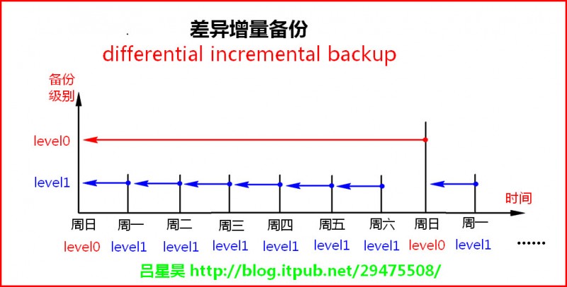 【RMAN增量备份】 差异性增量备份 differential incremental backup,备份最近一次0级或1级备份之后发生改变的数据块。 累积性增量备份 cumulative incremental backup,备份最近一次0级备份之后发生改变的数据块。 下面实验使用默认的 差异增量备份 备份策略:每周日执行0级备份,周一至周六每天执行1级增量备份 测试环境 整点进行0级备份,每10分钟1级增量备份一次