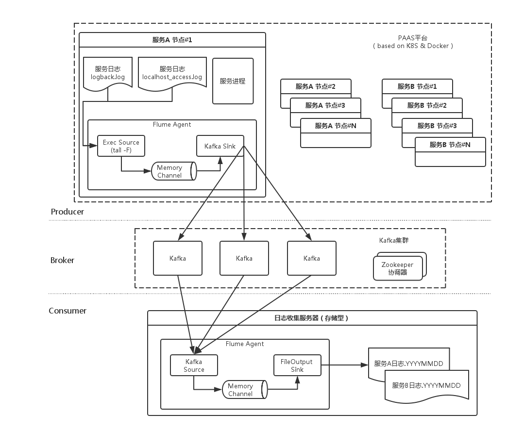 PaaS平台内的服务假设部署在Docker容器内,那么为了满足非功能需求#1,独立另外一个进程负责收集日志,因此不侵入服务框架和进程。采用 Flume NG 来进行日志的收集,这个开源的组件非常强大,可以看做一种监控、生产增量,并且可以发布、消费的模型,Source就是源,是增量源,Channel是缓冲通道,这里使用内存队列缓冲区,Sink就是槽,是个消费的地方。容器内的Source就是执行tail -F这个命令的去利用linux的标准输出读取增量日志,Sink是一个Kafka的实现,用于推送消息到分布式消息中间件。