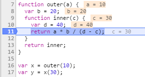 function outer(a) { var b= 20; function inner(c) { var d = 40; return a * b / (d c); } return inner; } var x = outer(10); var y = x(30); 这是一个实时调试会话中的同一段代码的快照: