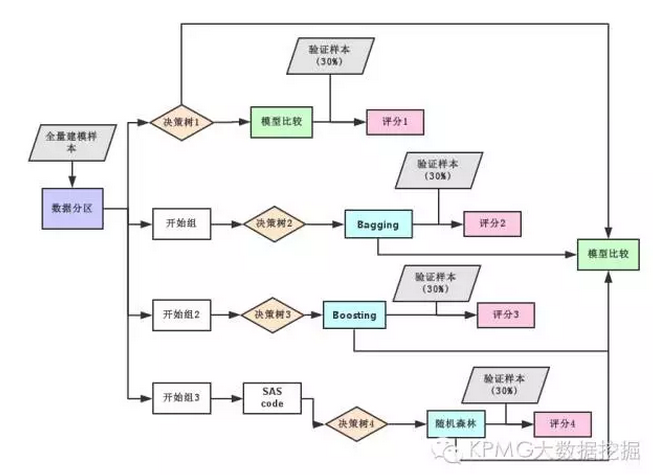 在建立各类模型前,笔者同样利用数据分区节点将全量的建模样本一分为二,其中70%作为训练样本、30%作为验证样本,然后再来逐个建立、验证决策树的单棵树模型和组合分类模型,并进行模型之间的比较分析和评估。
